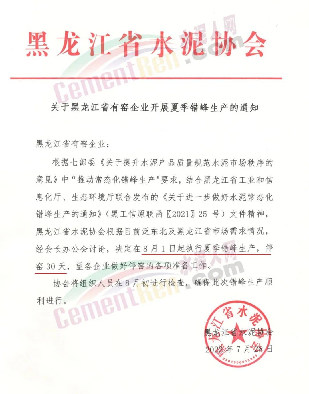 黑龍江省水泥協(xié)會發(fā)布《關于黑龍江省有窯企業(yè)開展夏季錯峰生產(chǎn)的通知》給黑龍江省有窯企業(yè)要求自在8月1日起執(zhí)行夏季錯峰生產(chǎn),停窯30天。