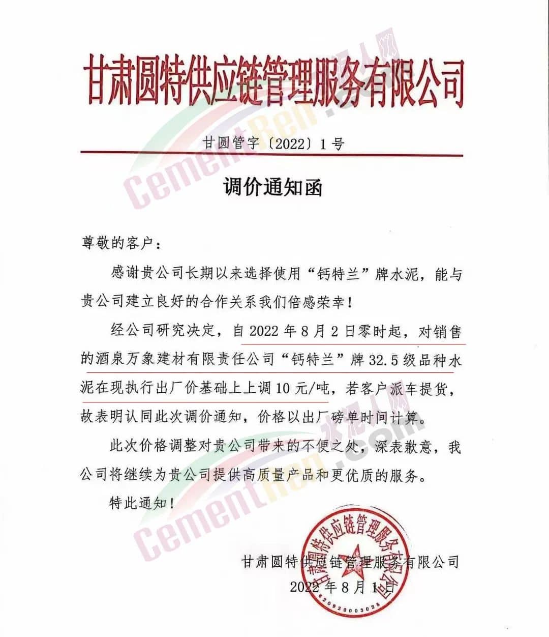 水泥人網(wǎng)通訊員消息:日前,甘肅圓特供應(yīng)鏈管理服務(wù)有限公司通知,自8月2日零時起,對銷售的酒泉萬象建材有限公司“鈣特蘭”牌32.5級品種水泥在現(xiàn)執(zhí)行出廠價基礎(chǔ)上上調(diào)10元/噸。