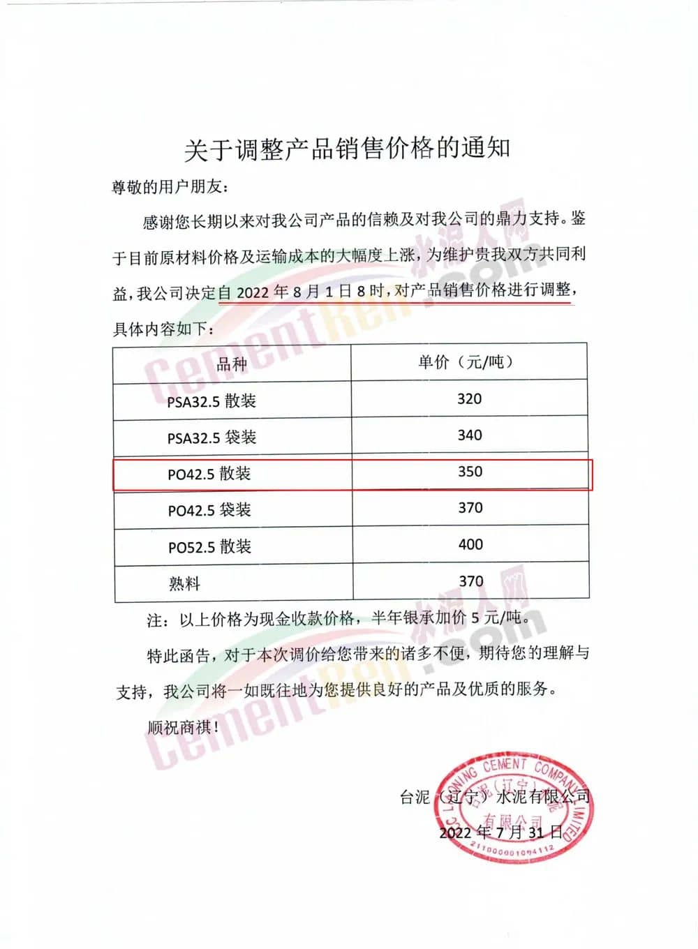 臺泥(遼寧)水泥有限公司通知稱,自8月1日8時起對產(chǎn)品銷售價格進(jìn)行調(diào)整,調(diào)整后P.O42.5散裝水泥報價350元/噸。