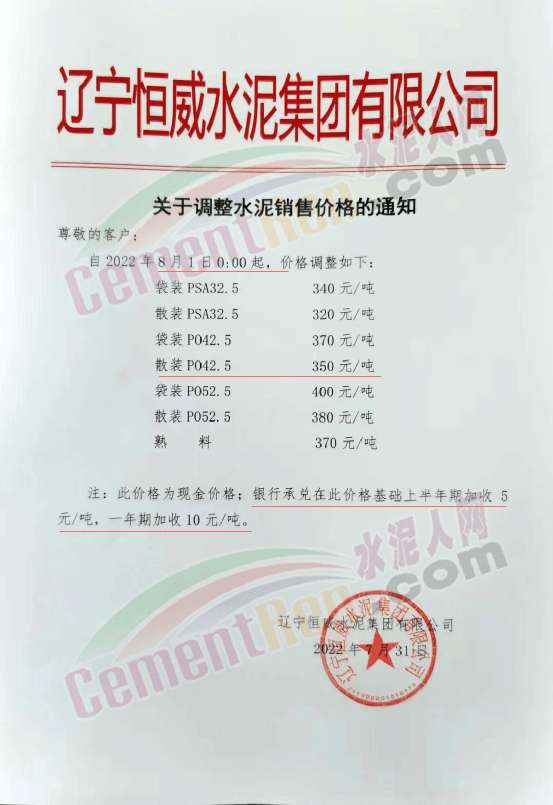 遼寧恒威水泥集團(tuán)有限公司通知,自8月1日起調(diào)整水泥報價,調(diào)整后P.O42.5散裝水泥報350元/噸。