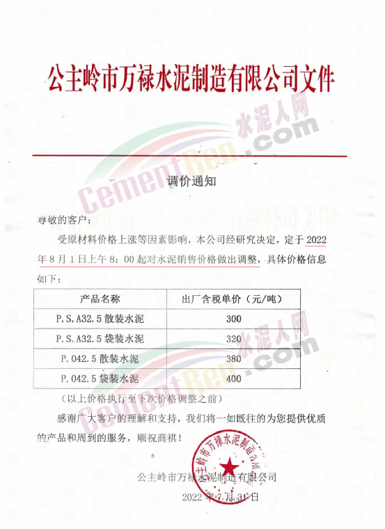 公主嶺市萬祿水泥制造有限公司通知自8月1日上午8時起對水泥銷售價格做出調(diào)整。調(diào)整后P.O42.5散裝水泥報價380元/噸。