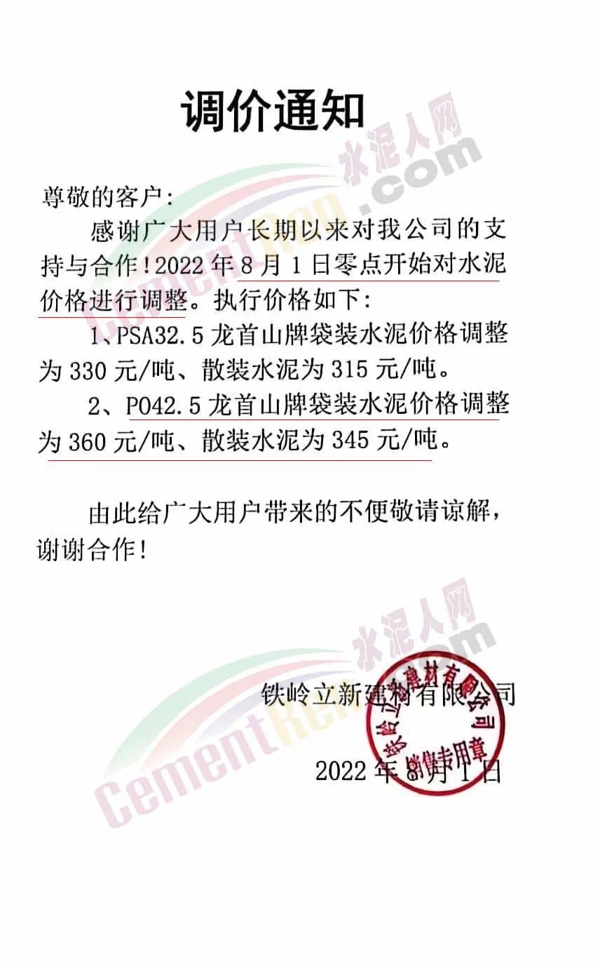 鐵嶺立新建材有限公司通知自8月1日零點(diǎn)開始對水泥價格進(jìn)行調(diào)整,調(diào)整后PSA32.5A龍首山袋裝水泥為330元/噸,散裝水泥為315元/噸。P.O42.5龍首山牌袋裝水泥為360元/噸,散裝水泥為345元/噸。