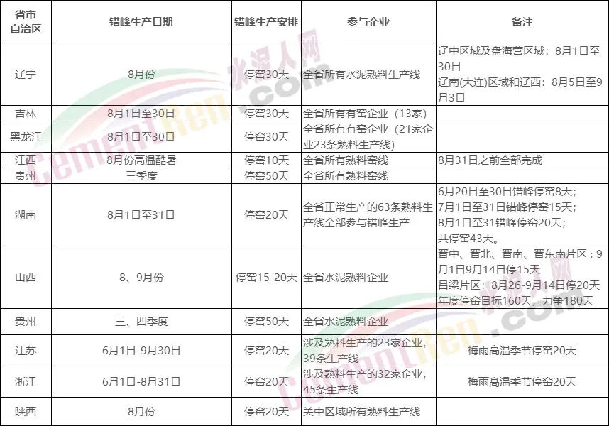 盤點(diǎn)近來發(fā)布錯峰生產(chǎn)的省市自治區(qū),部分8-9月份處于停窯的區(qū)域時間安排如下: