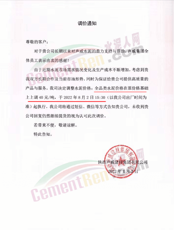 同日,銅川聲威建材有限責(zé)任公司通知自8月2日起上調(diào)全品類水泥價格40元/噸。