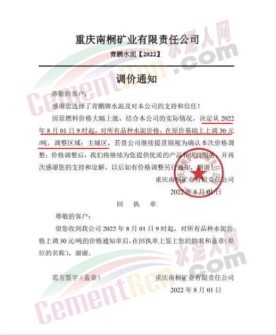 重慶金隅冀東水泥貿(mào)易有限公司通知,根據(jù)目前原材料上漲情況,經(jīng)公司研究決定,自8月1日8時起,銷往重慶主城區(qū)的所有水泥價格上調(diào)30元/噸。