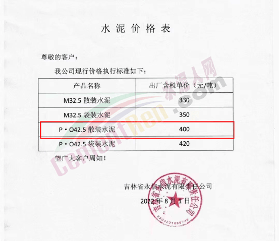 吉林省永信水泥有限公司8月1日發(fā)布最新價格執(zhí)行標(biāo)準(zhǔn),P.O42.5散裝水泥報價400元/噸。