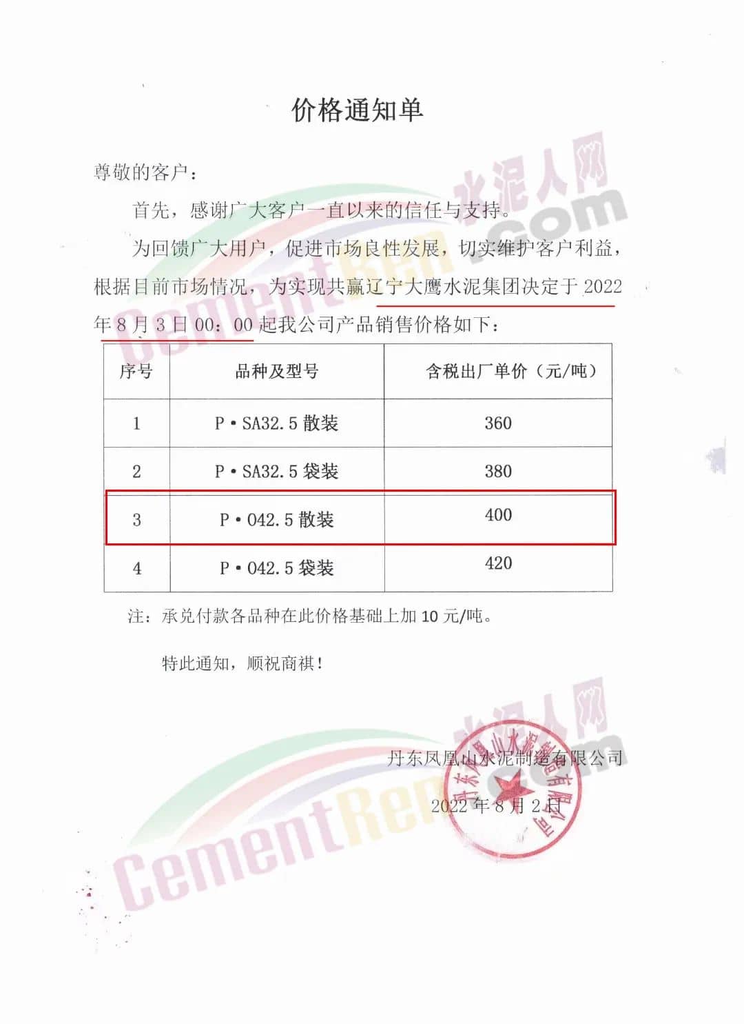 丹東鳳凰山水泥有限公司通知根據(jù)目前市場情況,遼寧大鷹水泥集團決定于8月3日0時起調(diào)整產(chǎn)品銷售價格,調(diào)整后P.O42.5散裝水泥報價400元/噸。