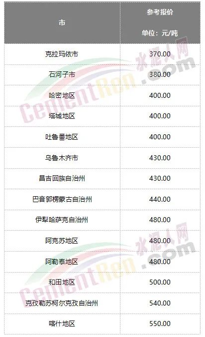 據(jù)水泥人網(wǎng)信息中心數(shù)據(jù),新疆維吾爾自治區(qū)內(nèi)主要品牌企業(yè)P.O42.5散裝水泥掛牌價(jià)在370~550元/噸之間,差價(jià)達(dá)180~360元/噸。