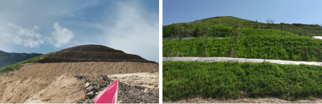 為此,芷蘭生態(tài)首先對嵯峨山項目區(qū)附近的鄉(xiāng)土植物進行了調研,再運回公司基地進行篩選與培育,并對喬、灌、草進行配比,最后采用“三網一板一巢”的工藝技術,對其進行修復,如下是修復前后的對比圖。