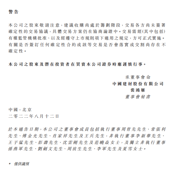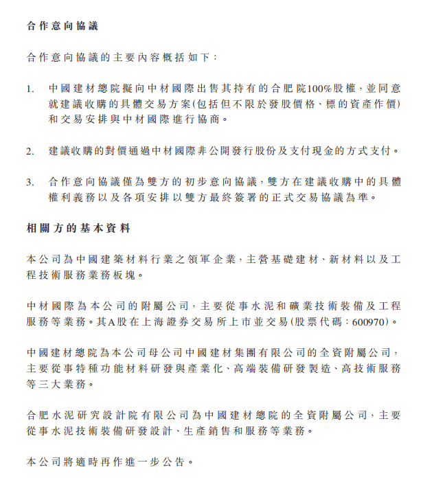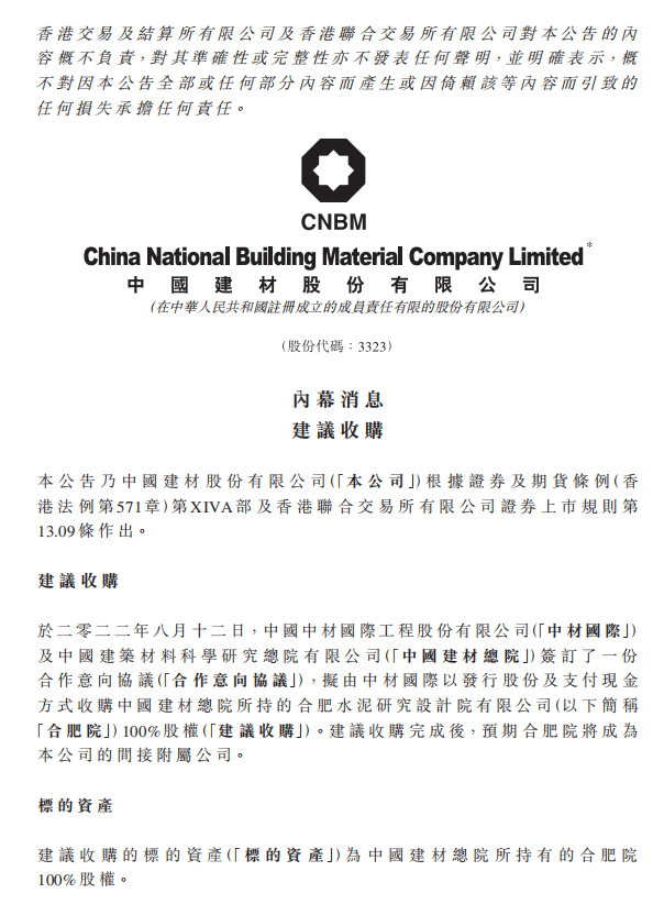 中國建材上市公司發(fā)布公告稱,于2022年8月12日,中國中材國際工程股份有限公司(「中材國際」)及中國建筑材料科學(xué)研究總院有限公司(「中國建材總院」)簽訂了一份合作意向協(xié)議(「合作意向協(xié)議」),擬由中材國際以發(fā)行股份及支付現(xiàn)金方式收購中國建材總院所持的合肥水泥研究設(shè)計院有限公司(以下簡稱「合肥院」)100%股權(quán)(「建議收購」)。建議收購?fù)瓿珊?,預(yù)期合肥院將成為本公司的間接附屬公司。