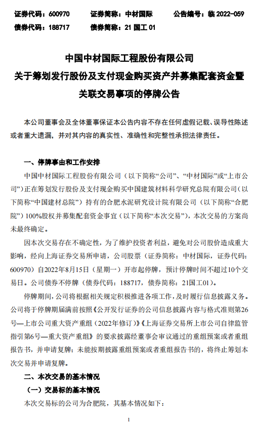 中材國際表示,本次交易存在不確定性,為維護(hù)投資者利益,避免對公司股價造成重大影響,公司股票自8月15日(星期一)開市起停牌,預(yù)計停牌時間不超過10個交易日。