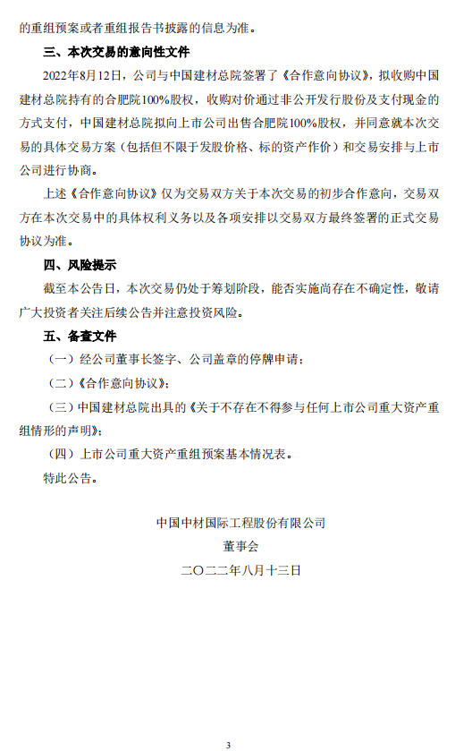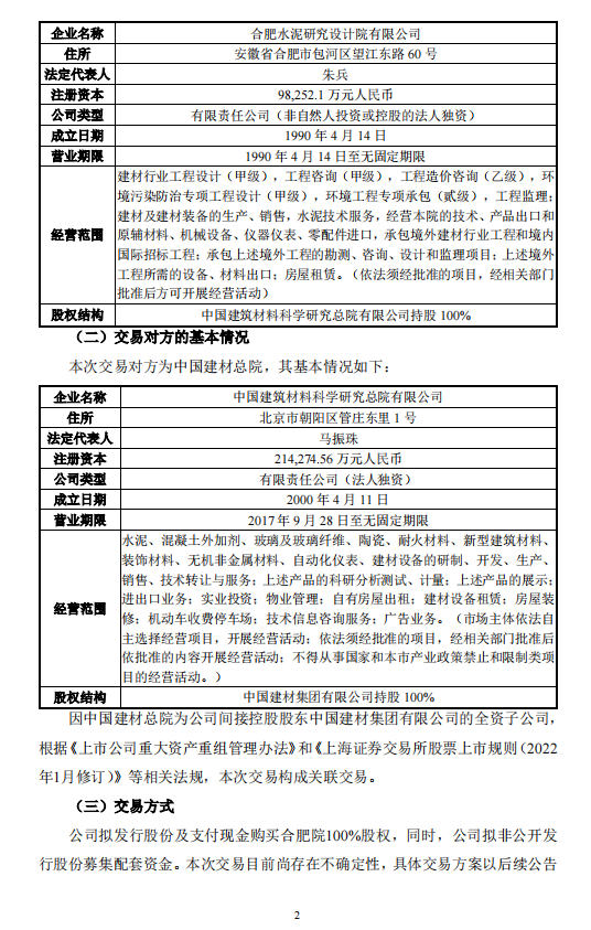 1.中國建材總院擬向中材國際出售其持有的合肥院100%股權(quán),并同意就建議收購的具體交易方案(包括但不限于發(fā)股價格、標(biāo)的資產(chǎn)作價)和交易安排與中材國際進(jìn)行協(xié)商。