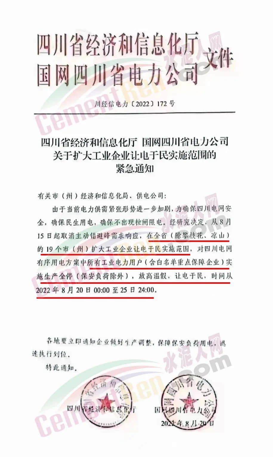 此前,四川利森建材、四川峨眉山西南水泥曾發(fā)《緊急告知函》通知于8月15日0:00起全面停產(chǎn),無法保障客戶正常水泥使用需求。另有包括海螺水泥在內(nèi)的多家企業(yè)通知限量、限時供應(yīng)水泥。水泥企業(yè)限電停產(chǎn),限量限時供應(yīng),疊加長江“汛期反枯”波及航運航道大幅收窄貨船減載,水泥供應(yīng)大幅減少。