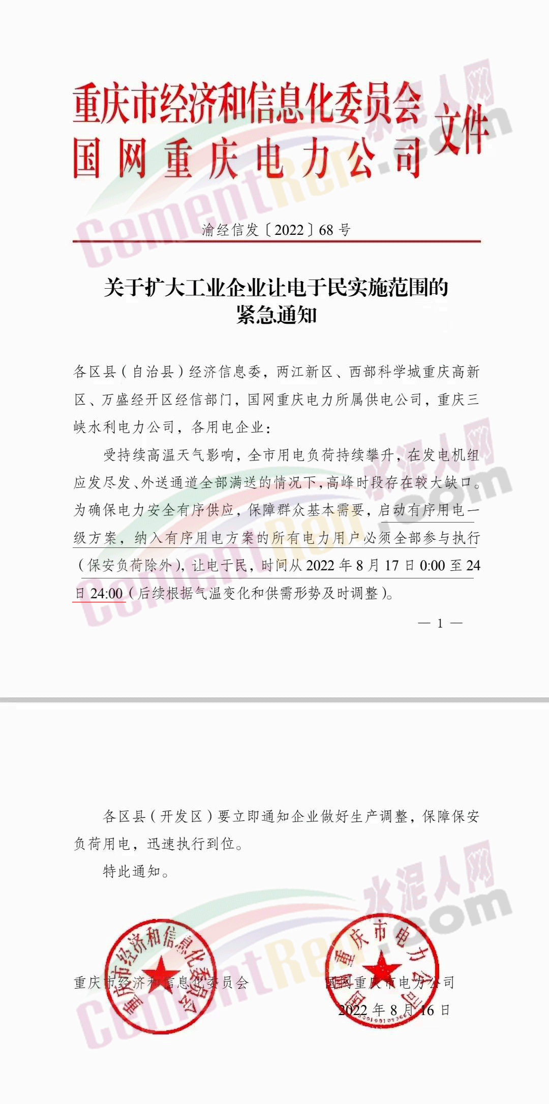 16日重慶發(fā)文從8月17日00點至24日24點啟動有序用電一級方案。
