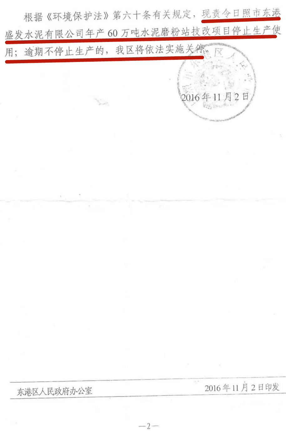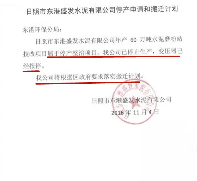 倒推時(shí)間軸,政府文件為證,2016年11月2號日照市東港區(qū)政府責(zé)令盛發(fā)停止生產(chǎn)的通知,11月4號企業(yè)上報(bào)區(qū)環(huán)保分局,明確:我公司將根據(jù)區(qū)政府要求落實(shí)搬遷計(jì)劃。