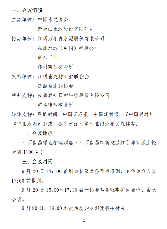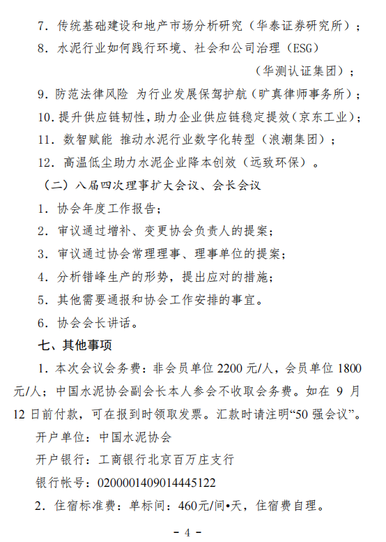 1.本次會議會務費:非會員單位2200元/人,會員單位1800元/人;中國水泥協(xié)會副會長本人參會不收取會務費。如在9月12日前付款,可在報到時領取發(fā)票。匯款時請注明“50強會議”。