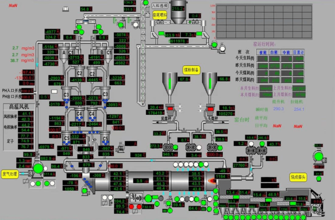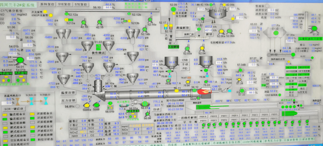 最近的一條標準設(shè)計的5000t/d生產(chǎn)線,在兩年前就全部打開三次風(fēng)管閥門運行的基礎(chǔ)上,采用了“節(jié)能型低氮燃燒器”,把噴煤管定位在中心線以上進行運行,再次取得了降低熱耗,提高產(chǎn)量,提高熟料強度,降低高溫風(fēng)機轉(zhuǎn)速和電流的明顯效果。并且在產(chǎn)量達到7000t/d的工況下,一級旋風(fēng)筒出口的壓力只有5000pa。創(chuàng)造了同類型同規(guī)格預(yù)熱器的最低壓力和最低的熱耗。該生產(chǎn)線的運行界面如下: