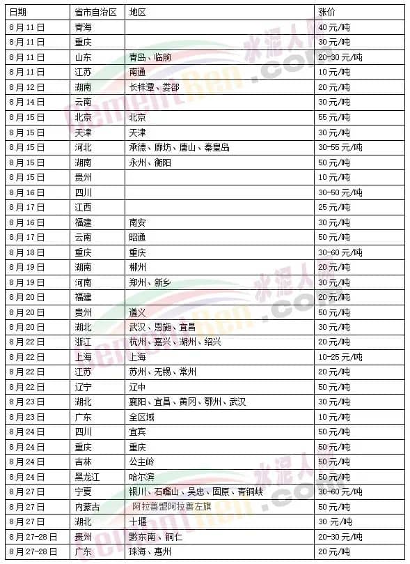 據(jù)水泥人網(wǎng)不完全統(tǒng)計7月中旬至8月初江蘇、浙江、上海、安徽、河南、山東、河北、福建、遼寧、吉林、陜西、重慶、四川、貴州、廣西等20多個區(qū)域水泥價格通知上調(diào)。進入8月中旬,發(fā)布漲價函的區(qū)域進一步擴大至青海、寧夏、內(nèi)蒙、黑龍江、湖北、北京、天津等30多個區(qū)域。