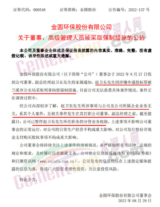水泥人網(wǎng)消息,日前金圓環(huán)保發(fā)布公告稱收到公司董事、副總經(jīng)理趙衛(wèi)東家屬通知,趙衛(wèi)東因涉嫌串通投標罪被蘭溪市公安局采取刑事拘留強制措施。公告提到,趙衛(wèi)東所涉事項與公司及公司所屬企業(yè)業(yè)務(wù)無關(guān),系其個人案件,且相關(guān)事件發(fā)生在其任職公司董事、副總經(jīng)理之前。且公司已暫停趙衛(wèi)東所任職務(wù)的分管業(yè)務(wù)權(quán)限。