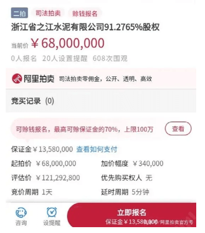 2021年9月24日在阿里拍賣平臺上,由浙江省金華市中級人民法院處置的杭州黑社會組織“骨干”王觀成名下浙江省之江水泥有限公司91.2765%股份公開拍賣。記者從拍賣平臺獲悉,王觀成所涉案件位列近年浙江省掃黑除惡案例榜首,他和首要分子虞關(guān)榮、戴國松一審均被判無期徒刑,并處沒收個人全部財產(chǎn)。