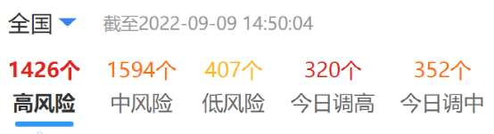 據(jù)公開消息,截止9月9日14時(shí)50分,全國高風(fēng)險(xiǎn)地區(qū)1426個(gè)。當(dāng)日調(diào)高320個(gè)。中風(fēng)險(xiǎn)1594個(gè),當(dāng)日調(diào)中352個(gè)。高風(fēng)險(xiǎn)區(qū)域分別分布于黑龍江、四川、新疆、吉林、貴州、青海、內(nèi)蒙古、廣西、江西、西藏、廣東、海南、山東、遼寧、天津、湖北、河南、北京、陜西、甘肅、安徽、上海、江蘇等23個(gè)省市自治區(qū)區(qū)域內(nèi)。