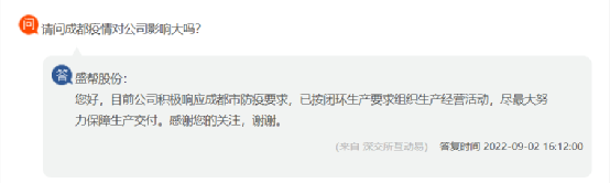 盛幫股份回復(fù),目前公司積極響應(yīng)成都市防疫要求,已按閉環(huán)生產(chǎn)要求組織生產(chǎn)經(jīng)營活動(dòng),盡最大努力保障生產(chǎn)交付。