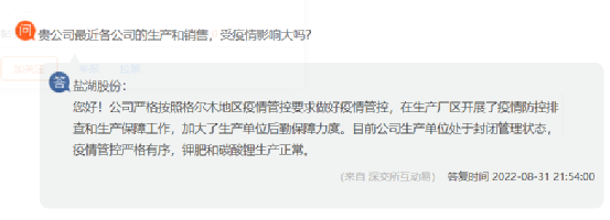 鹽湖股份回復(fù):公司嚴(yán)格按照格爾木地區(qū)疫情管控要求做好疫情管控,在生產(chǎn)廠區(qū)開展了疫情防控排查和生產(chǎn)保障工作,加大了生產(chǎn)單位后勤保障力度。目前公司生產(chǎn)單位處于封閉管理狀態(tài),疫情管控嚴(yán)格有序,鉀肥和碳酸鋰生產(chǎn)正常。