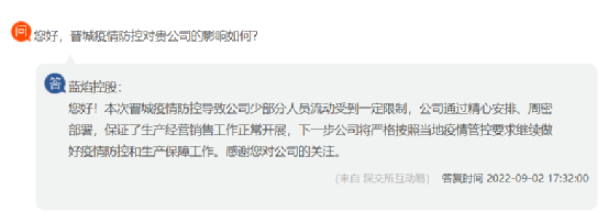 山西晉城藍(lán)焰控股回復(fù)本次晉城疫情防控導(dǎo)致公司少部分人員流動(dòng)受到一定限制,公司通過精心安排、周密部署,保證了生產(chǎn)經(jīng)營銷售工作正常開展,下一步公司將嚴(yán)格按照當(dāng)?shù)匾咔楣芸匾罄^續(xù)做好疫情防控和生產(chǎn)保障工作。