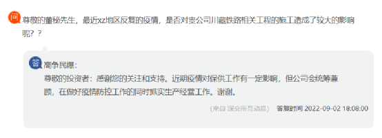 西藏高爭民爆針對投資者提出的西藏地區(qū)反復(fù)的疫情是否川藏鐵路相關(guān)工程施工造成較大影響回復(fù)稱,近期疫情對保供工作有一定影響,但公司會統(tǒng)籌兼顧,在做好疫情防控工作的同時(shí)抓實(shí)生產(chǎn)經(jīng)營工作。