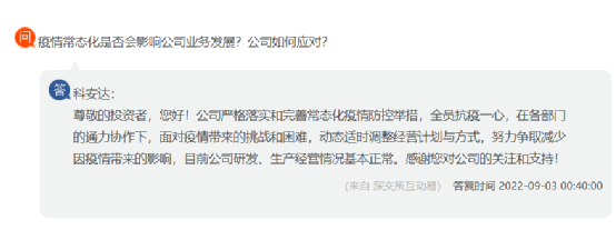 深圳從事軌道交通產(chǎn)品研發(fā)、生產(chǎn)、銷售的科安達(dá)回復(fù)公司嚴(yán)格落實(shí)和完善常態(tài)化疫情防控舉措,全員抗疫一心,在各部門的通力協(xié)作下,面對疫情帶來的挑戰(zhàn)和困難,動(dòng)態(tài)適時(shí)調(diào)整經(jīng)營計(jì)劃與方式,努力爭取減少因疫情帶來的影響,目前公司研發(fā)、生產(chǎn)經(jīng)營情況基本正常。