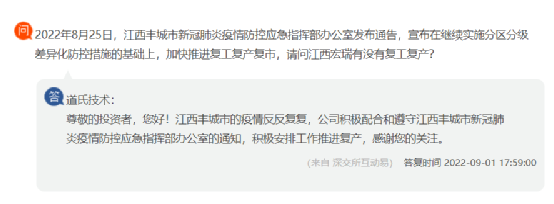江西道氏技術(shù)回復(fù)投資者稱,江西豐城市的疫情反反復(fù)復(fù),公司積極配合和遵守江西豐城市新冠肺炎疫情防控應(yīng)急指揮部辦公室的通知,積極安排工作推進(jìn)復(fù)產(chǎn)。