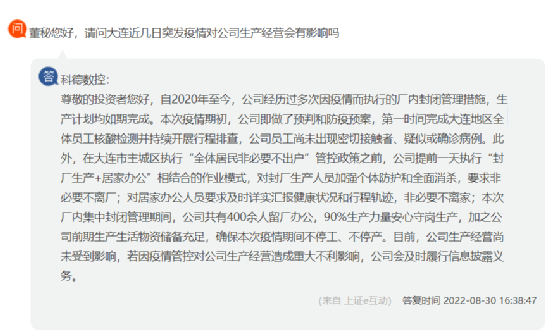 科德數(shù)控回復(fù)稱,本次疫情期初,公司即做了預(yù)判和防疫預(yù)案,第一時(shí)間完成大連地區(qū)全體員工核酸檢測并持續(xù)開展行程排查,公司員工尚未出現(xiàn)密切接觸者、疑似或確診病例。此外,在大連市主城區(qū)執(zhí)行“全體居民非必要不出戶”管控政策之前,公司提前一天執(zhí)行“封廠生產(chǎn)+居家辦公”相結(jié)合的作業(yè)模式,對封廠生產(chǎn)人員加強(qiáng)個(gè)體防護(hù)和全面消殺,要求非必要不離廠;對居家辦公人員要求及時(shí)詳實(shí)匯報(bào)健康狀況和行程軌跡,非必要不離家;本次廠內(nèi)集中封閉管理期間,公司共有400余人留廠辦公,90%生產(chǎn)力量安心守崗生產(chǎn),加之公司前期生產(chǎn)生活物資儲備充足,確保本次疫情期間不停工、不停產(chǎn)。目前,公司生產(chǎn)經(jīng)營尚未受到影響。