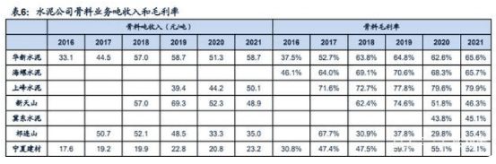 骨料資源屬性帶來(lái)高盈利壁壘,區(qū)域間有明顯分化。一方面,2016~2019年由于環(huán)保等因素關(guān)停大量小礦山,在淘汰落后產(chǎn)能的同時(shí)、新增產(chǎn)能補(bǔ)充不及時(shí),礦山數(shù)量和砂石產(chǎn)量明顯減少,造成骨料供需短期失衡,價(jià)格大幅上漲。全國(guó)砂石骨料均價(jià)從2016年的46元/噸漲至2020年的100元/噸以上。海螺水泥骨料毛利率從2016年的46%升至2021年的68.34%;華新骨料業(yè)務(wù)毛利率從2016年的37.5%上漲至2021年的65.6%;上峰水泥2021年砂石骨料毛利率高達(dá)79.92%……