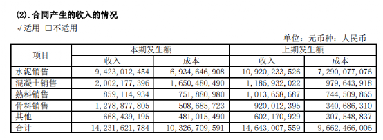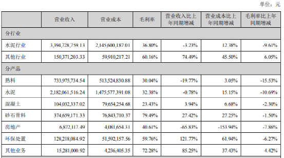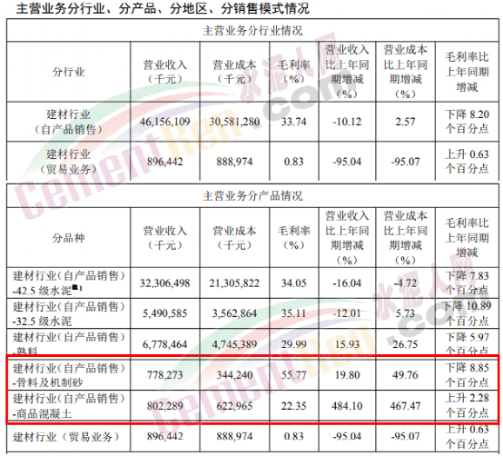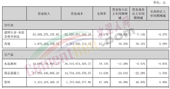 報(bào)告期內(nèi),42.5級(jí)水泥毛利率同比上升2.03個(gè)百分點(diǎn),32.5級(jí)水泥毛利率同比下降1.84個(gè)百分點(diǎn),熟料毛利率同比上升6.72個(gè)百分點(diǎn);其中集團(tuán)自產(chǎn)品42.5級(jí)水泥毛利率、32.5級(jí)水泥毛利率、熟料毛利率同比分別下降7.83個(gè)百分點(diǎn)、10.89個(gè)百分點(diǎn)、5.97個(gè)百分點(diǎn)。骨料及機(jī)制砂綜合毛利率為55.77%,同比下降8.85個(gè)百分點(diǎn);商品混凝土綜合毛利率22.35%,同比上升2.28個(gè)百分點(diǎn)。