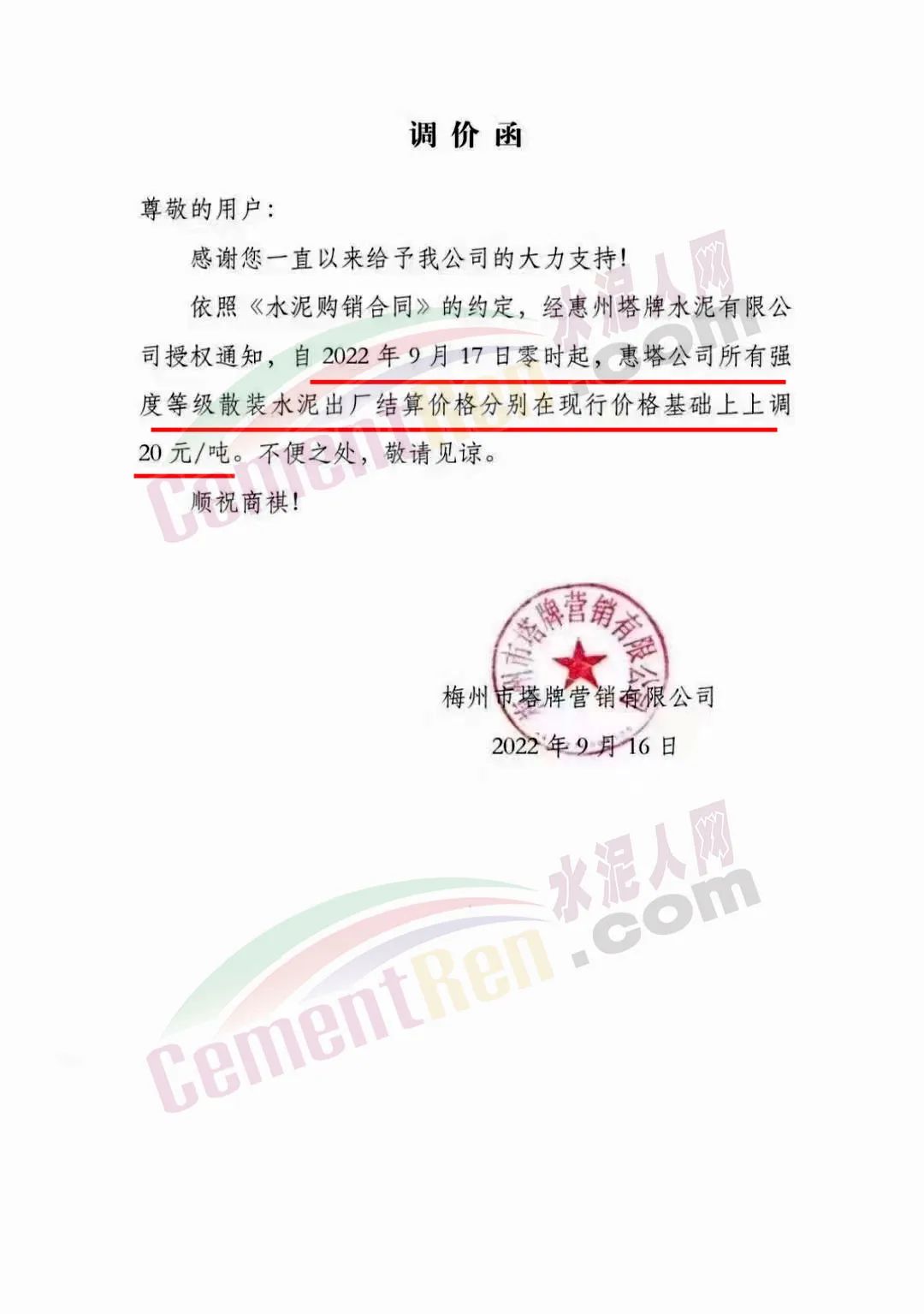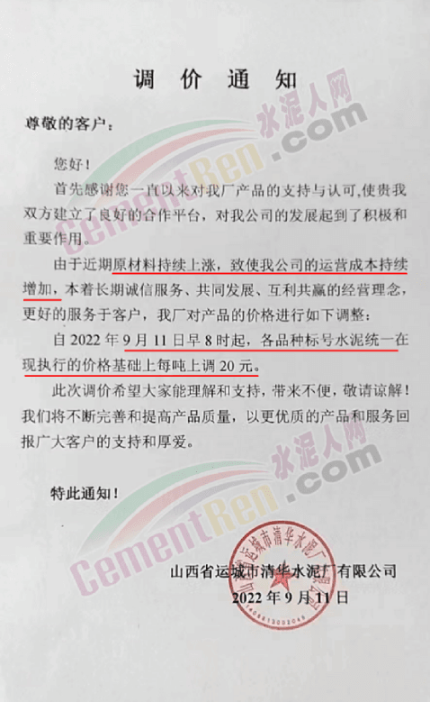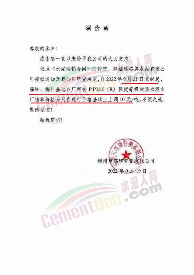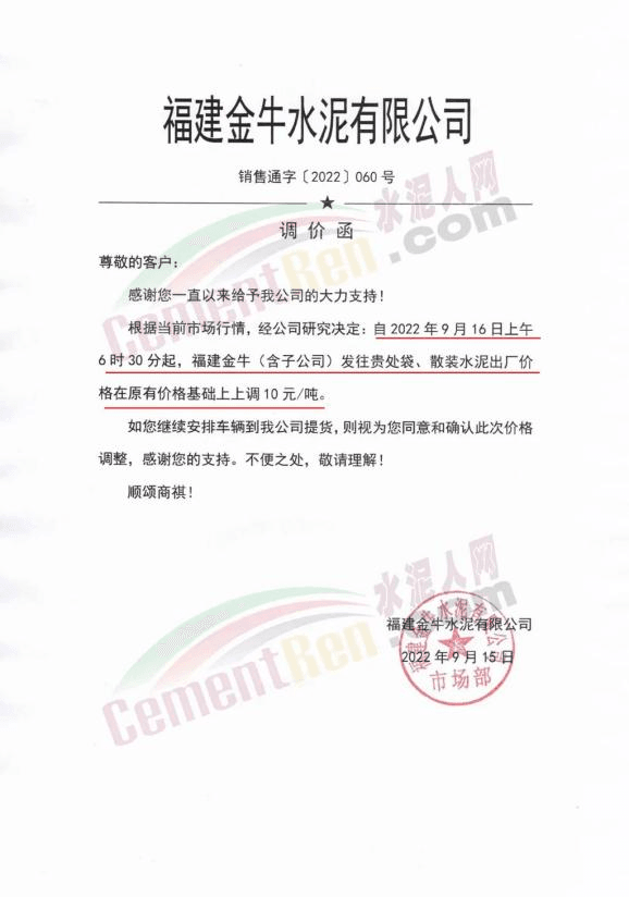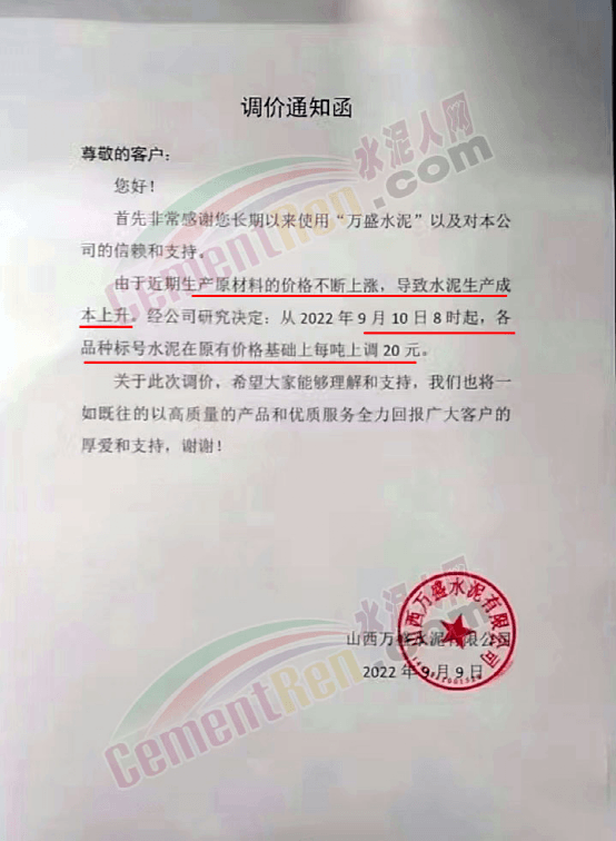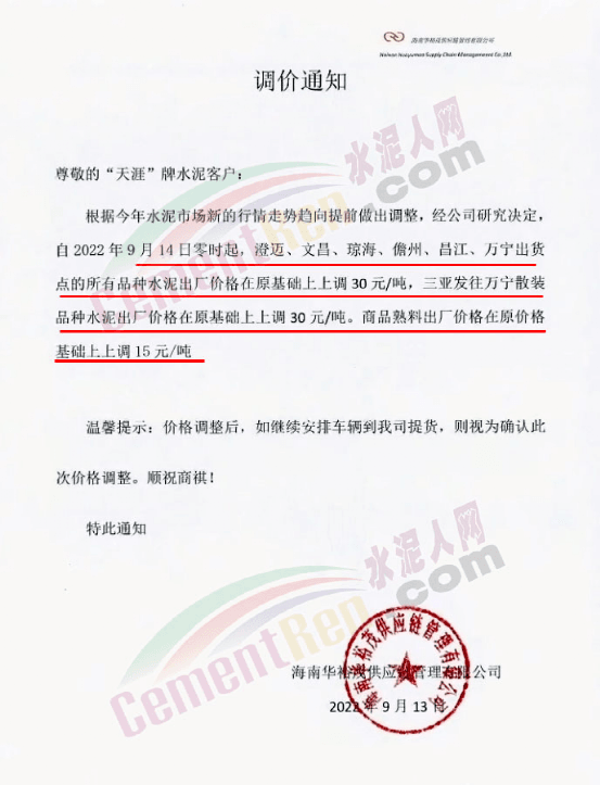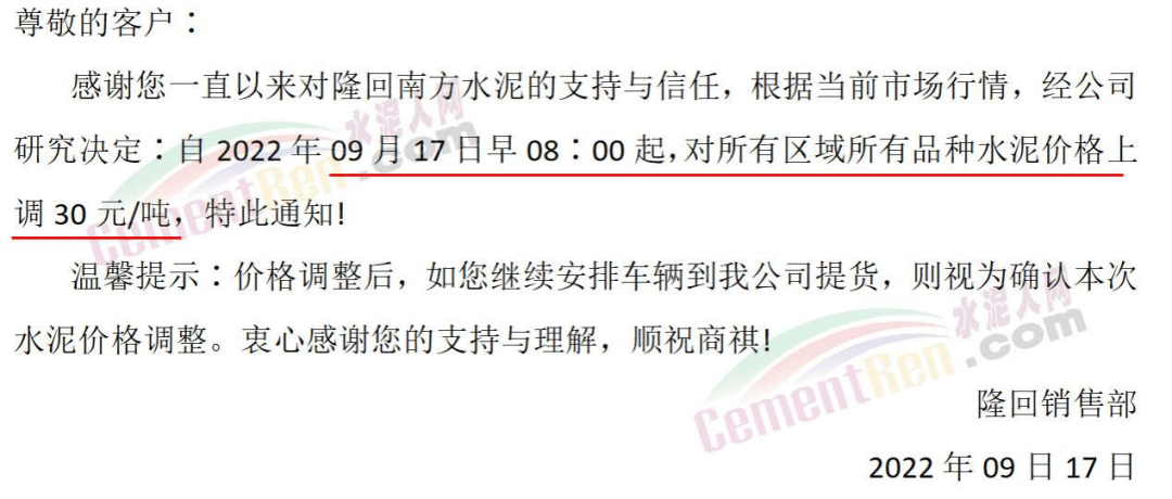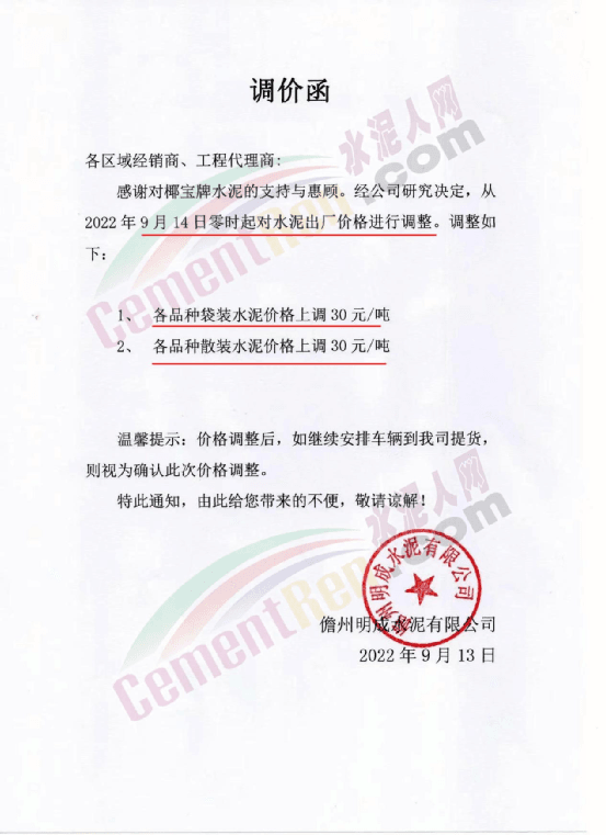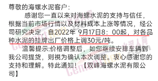 雙峰海螺水泥有限公司通知,根據(jù)當(dāng)前市場(chǎng)行情以及材料成本上漲等情況,經(jīng)公司研究決定,自2022年9月17日800起,對(duì)各品種水泥的掛牌出廠價(jià)格上調(diào)30元/噸。