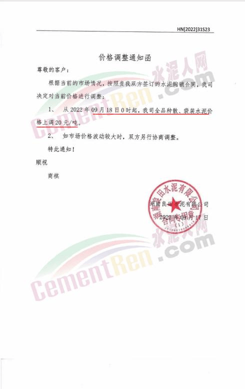華潤(rùn)水泥旗下湖南良田水泥有限公司通知,9月18日0時(shí)起,公司全品種散裝、袋裝水泥價(jià)格上調(diào)20元/噸。
