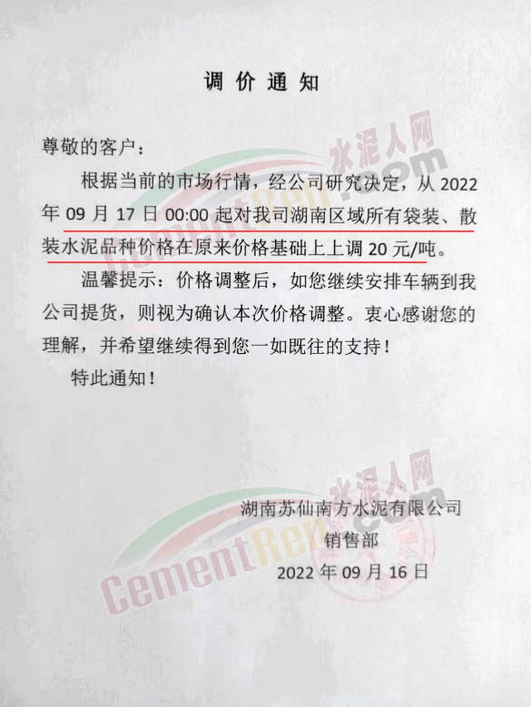 湖南蘇仙南方通知,自9月17日0時(shí)起對(duì)湖南區(qū)域所有袋裝、散裝水泥價(jià)格上調(diào)20元/噸。