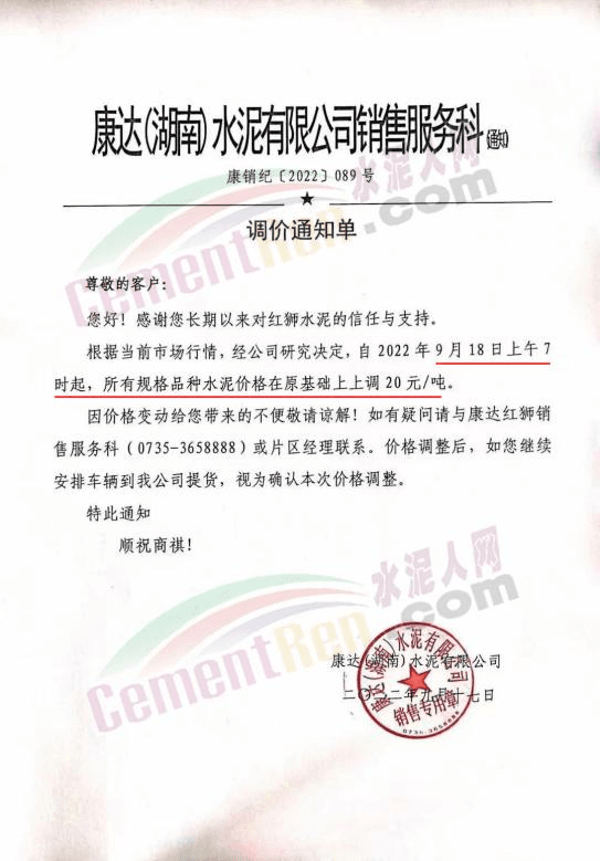 紅獅水泥旗下康達(dá)(湖南)水泥有限公司銷售服務(wù)科通知自9月18日上午7時(shí)起,所有規(guī)格品種水泥價(jià)格在原基礎(chǔ)上上調(diào)20元/噸。