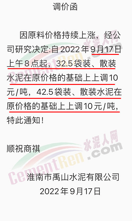 淮南市禹山水泥有限公司通知因原料價(jià)格持續(xù)上漲,經(jīng)公司研究決定∶自9月17日上午8點(diǎn)起,32.5袋裝、散裝水泥在原價(jià)格的基礎(chǔ)上上調(diào)10 元/噸,42.5袋裝、散裝水泥在原價(jià)格的基礎(chǔ)上上調(diào)10元/噸。
