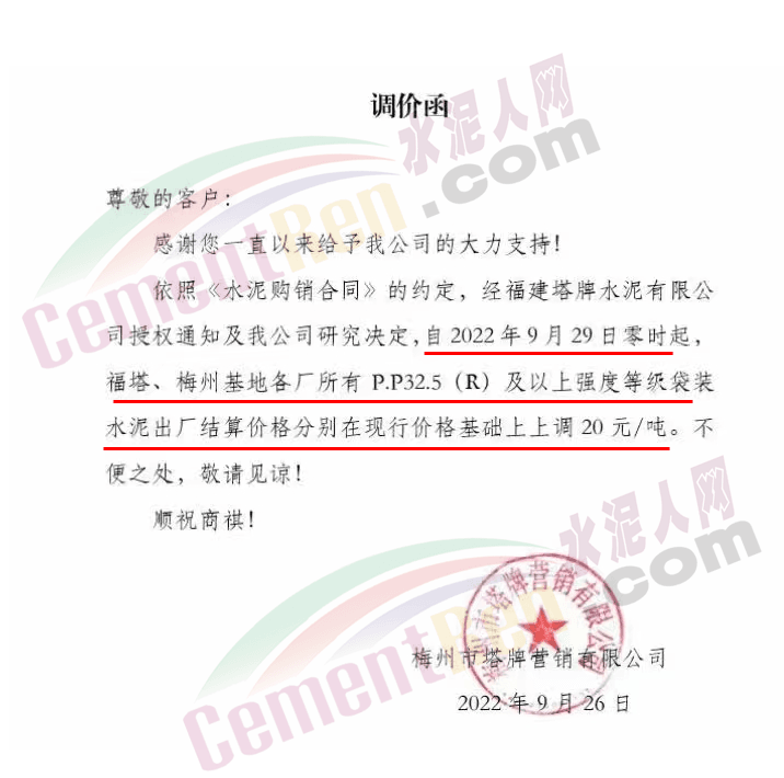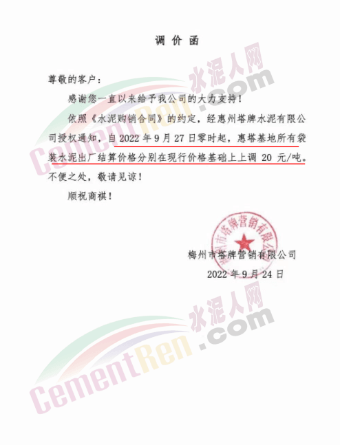 梅州市塔牌營銷有限公司自2022年9月29日零時(shí)起,福塔、梅州基地各廠所有PP325(R)及以上強(qiáng)度等級袋裝水泥出廠結(jié)算價(jià)格分別在現(xiàn)行價(jià)格基礎(chǔ)上上調(diào)20元/噸。