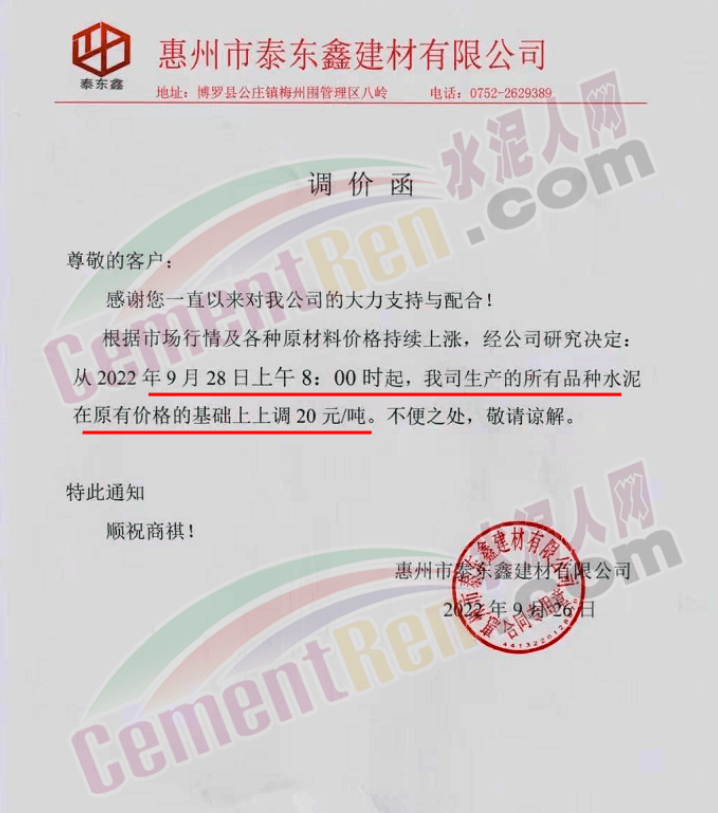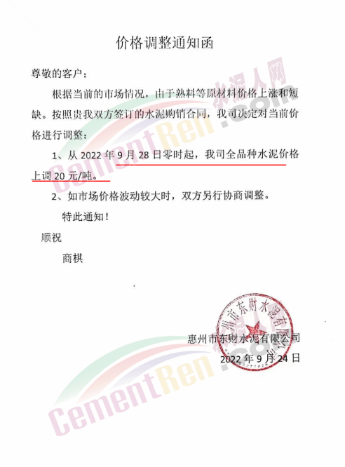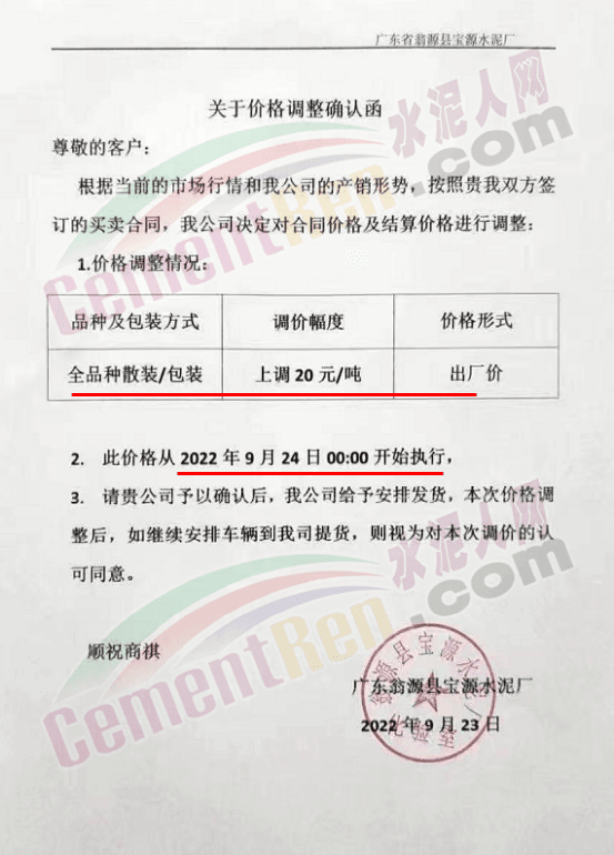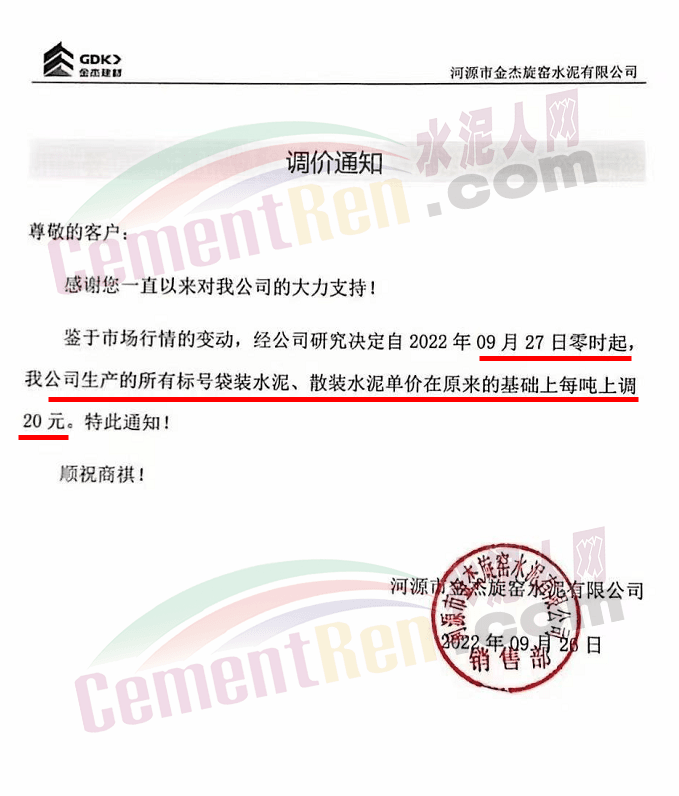 河源市金杰旋窯水泥有限公司通知鑒于市場行情的變動,經(jīng)公司研究決定自2022年09月27日零時(shí)起公司生產(chǎn)的所有標(biāo)號袋裝水泥、散裝水泥單價(jià)在原來的基礎(chǔ)上每噸上調(diào)20元。