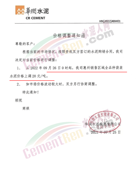 惠州市光大水泥企業(yè)有限公司通知,自9月27日0時(shí)起,水泥價(jià)格上調(diào)20元/噸。
