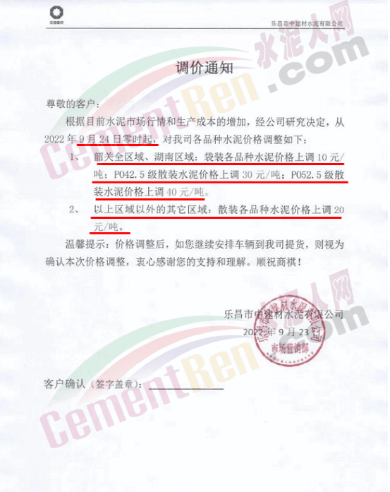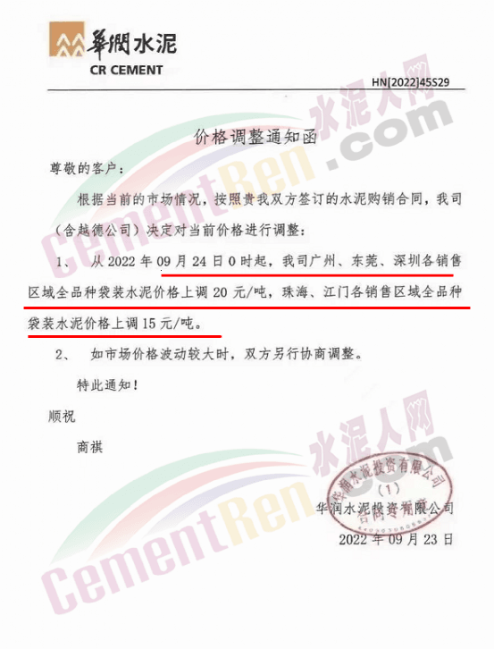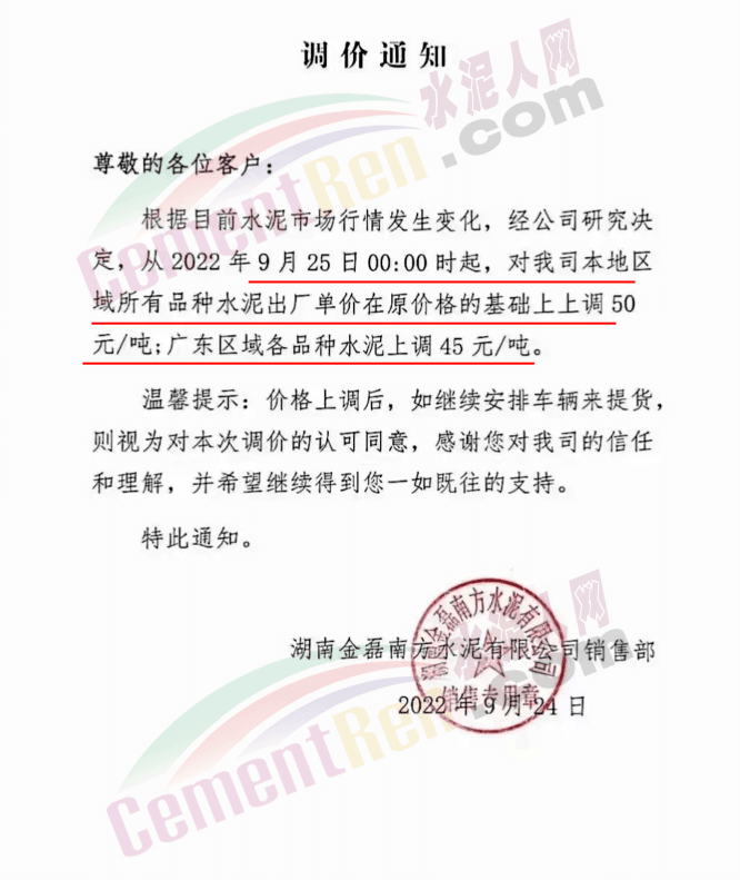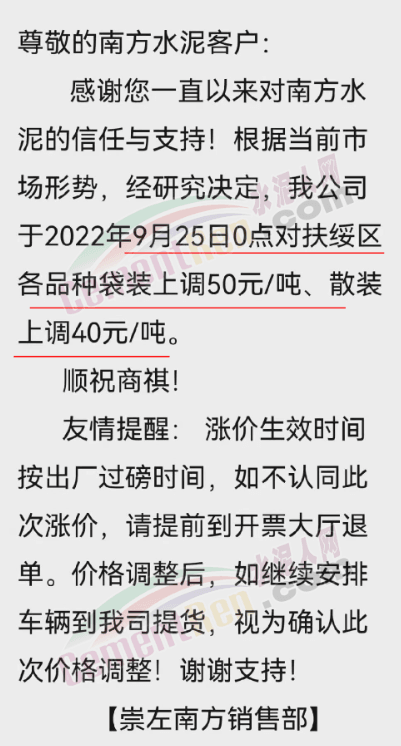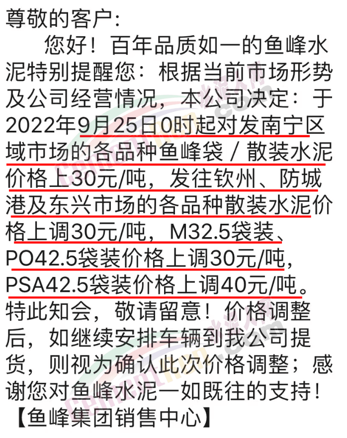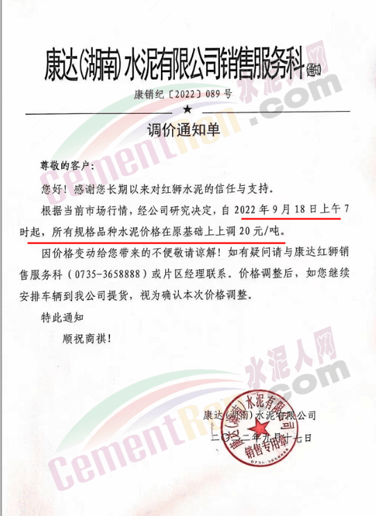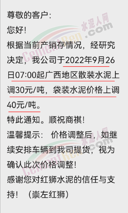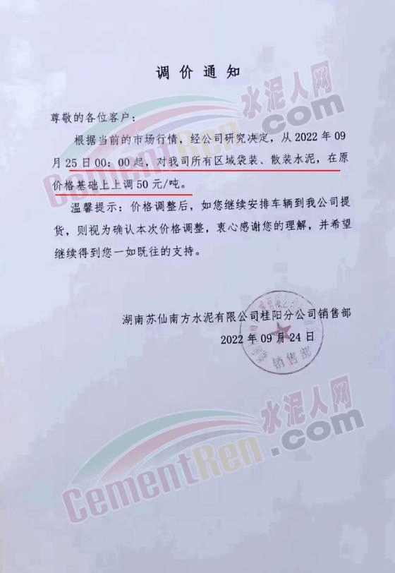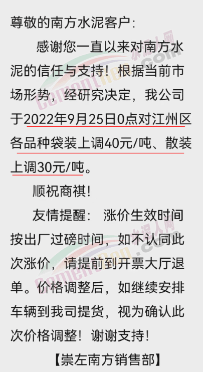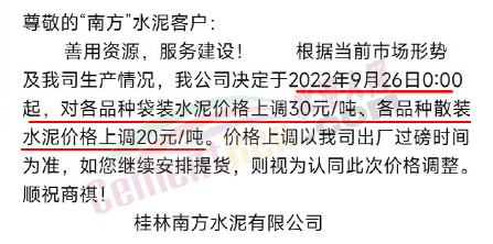桂林南方水泥有限公司通知, 根據(jù)當(dāng)前市場形勢及我司生產(chǎn)情況,公司決定于2022年9月26日0:00起,對各品種袋裝水泥價(jià)格上調(diào)30元/噸、各品種散裝水泥價(jià)格上調(diào)20元/噸。