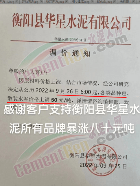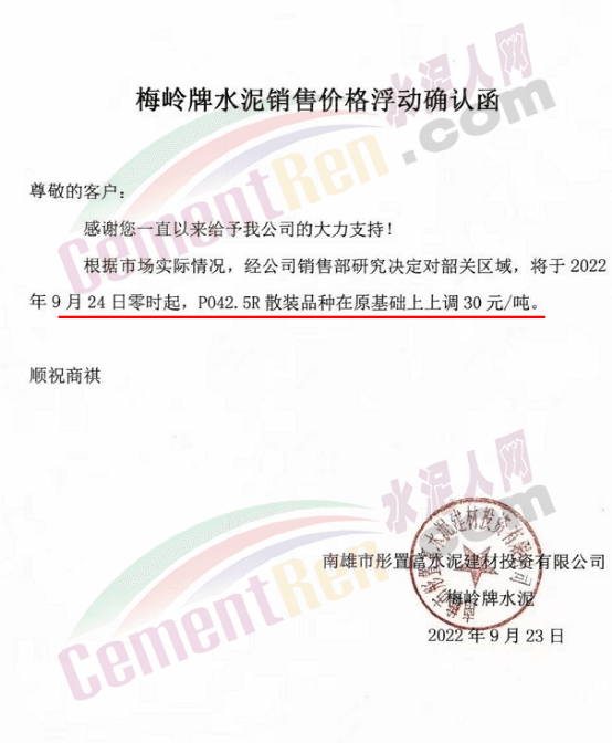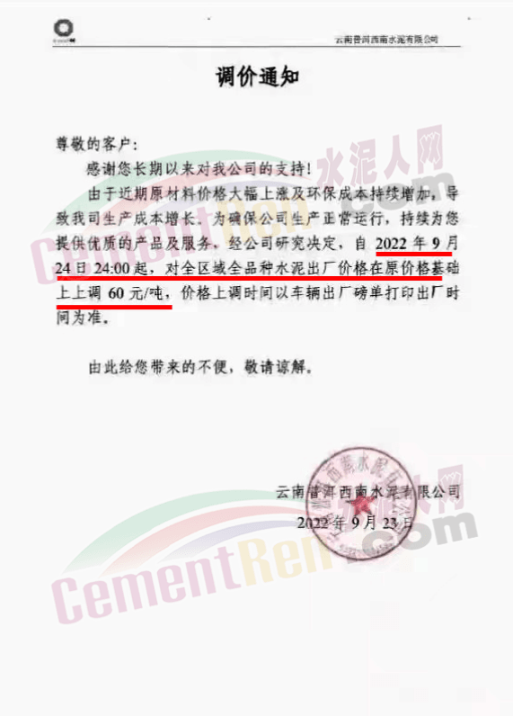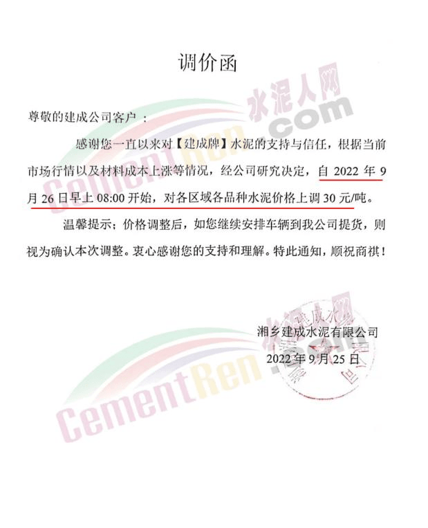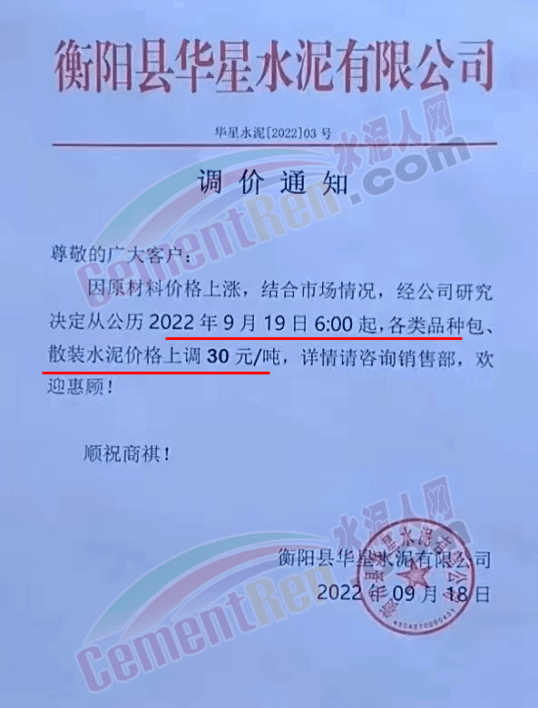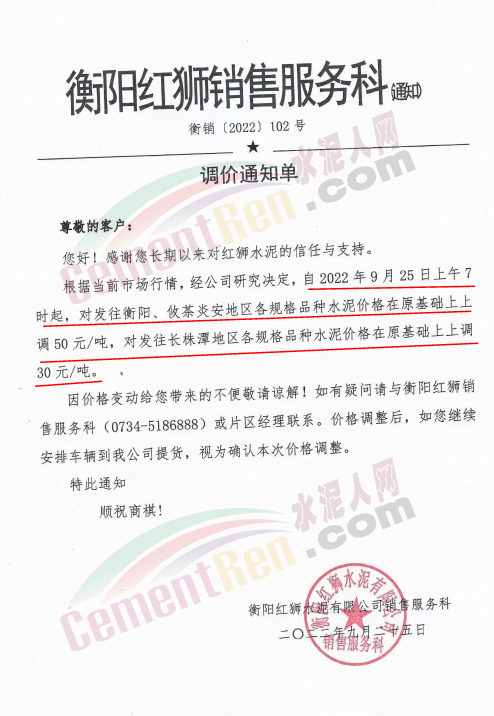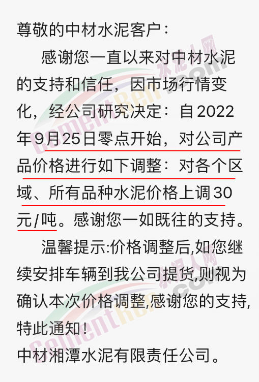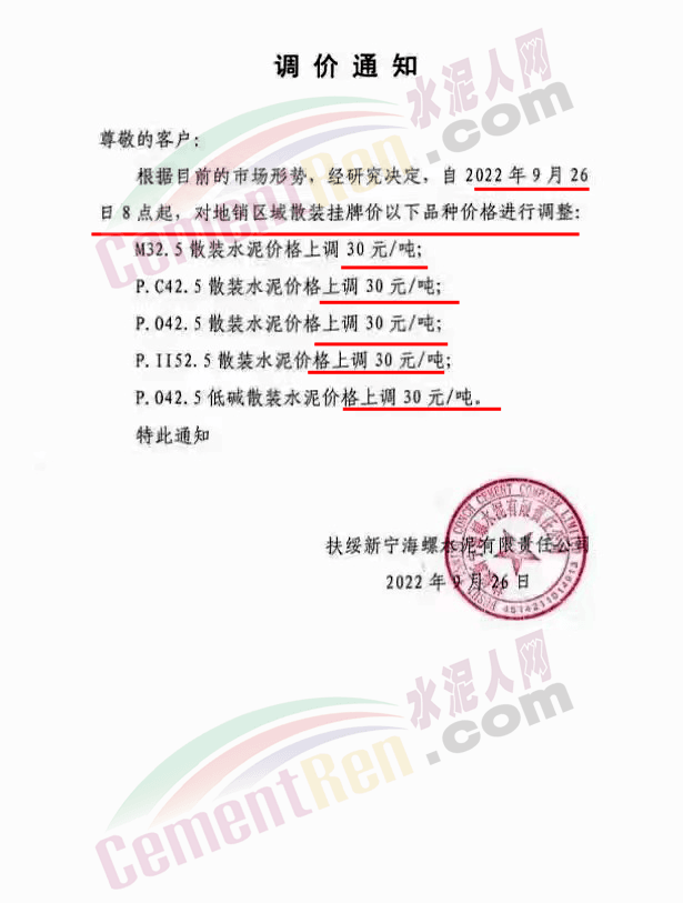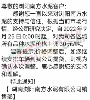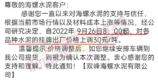 雙峰海螺水泥通知自2022年 9月26日8:00起,對各品種水泥的掛牌出廠價(jià)格上調(diào)30元/噸。
