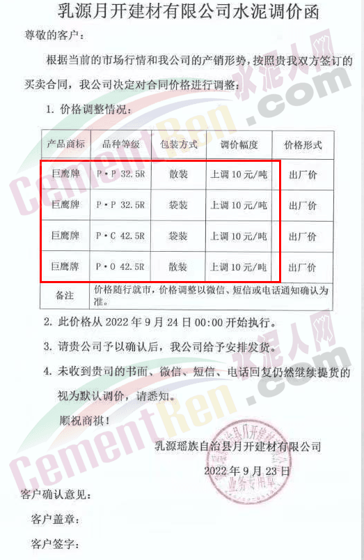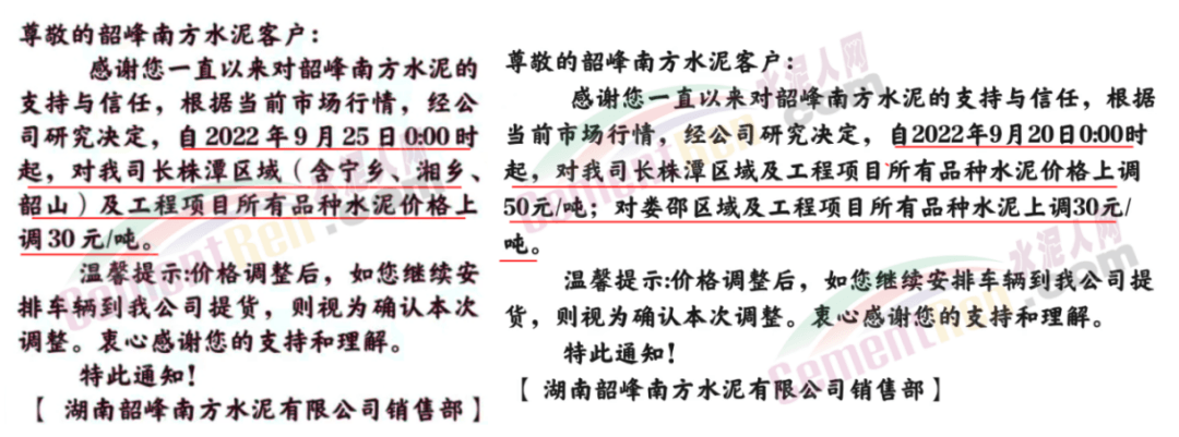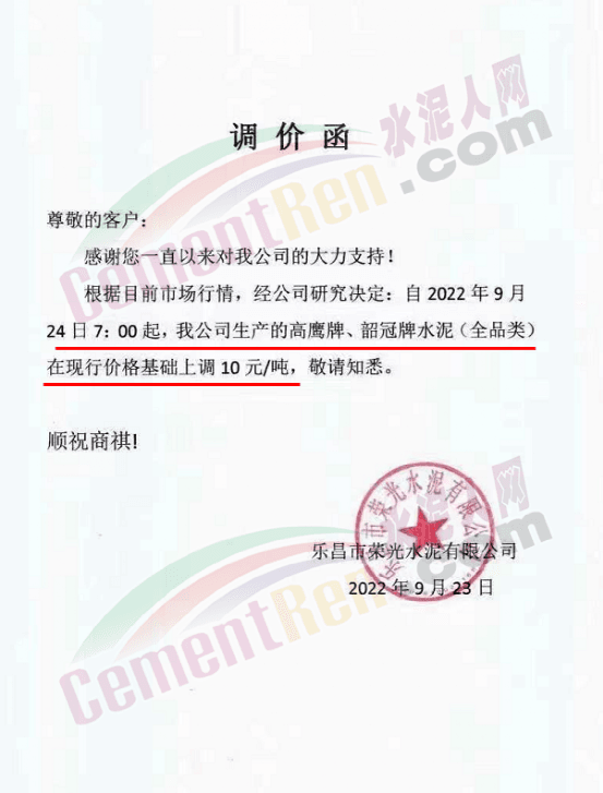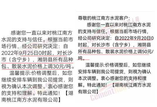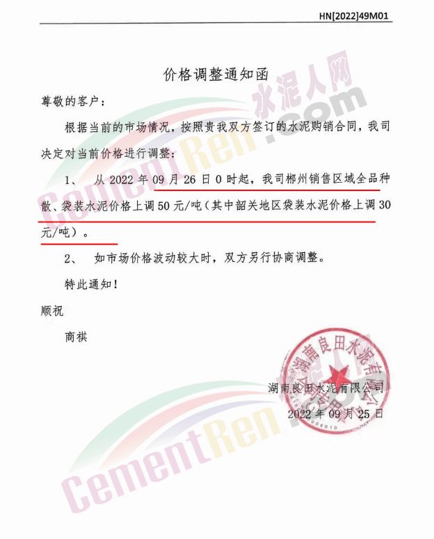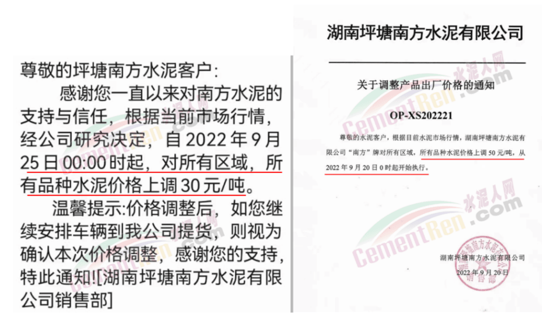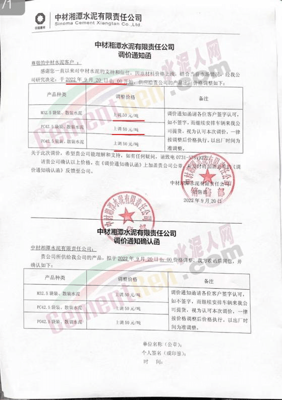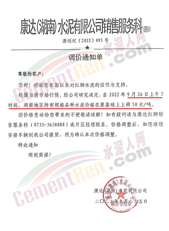 雙峰海螺水泥通知自2022年 9月26日8:00起,對各品種水泥的掛牌出廠價(jià)格上調(diào)30元/噸。
