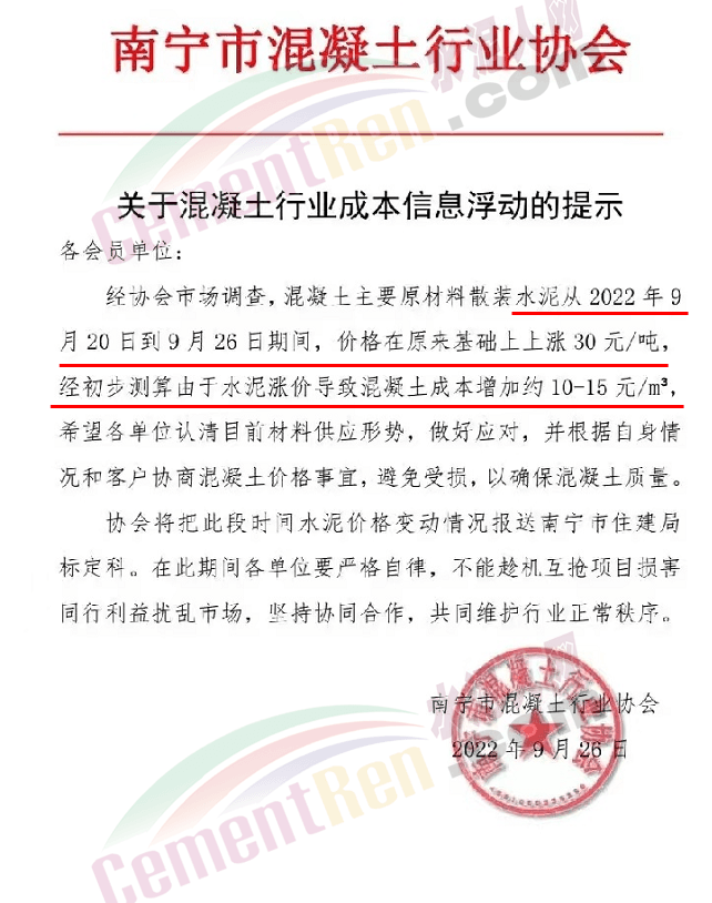 南寧市混凝土協(xié)會發(fā)提示函稱,水泥價(jià)格上漲30元/噸,混凝土成本增加約10-15元/立方,希望各單位做好應(yīng)對。