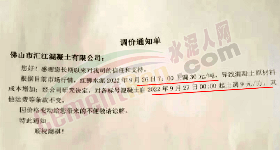某混凝土企業(yè)通知,紅獅水泥9月26日7時(shí)上調(diào)30元/噸,企業(yè)對各標(biāo)號混凝土同步上調(diào)9元/方。