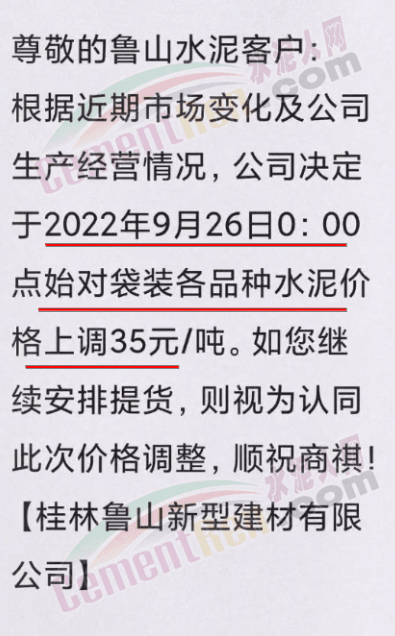 桂林魯山新型建材有限公司自9月26日0時(shí)起,對袋裝水泥價(jià)格上調(diào)35元/噸。
