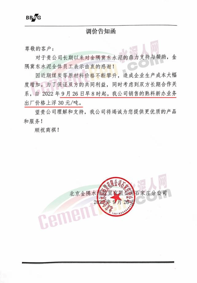 北京金隅水泥經(jīng)貿(mào)有限公司石家莊分公司通知,因近期煤炭等原材料 價(jià)格不斷攀升,造成企業(yè)生產(chǎn)成本大幅度增加。考慮到雙方長期合作關(guān)系,9月26日早8時(shí)起,公司銷售的熟料新辦業(yè)務(wù)出廠價(jià)上浮30元/噸。