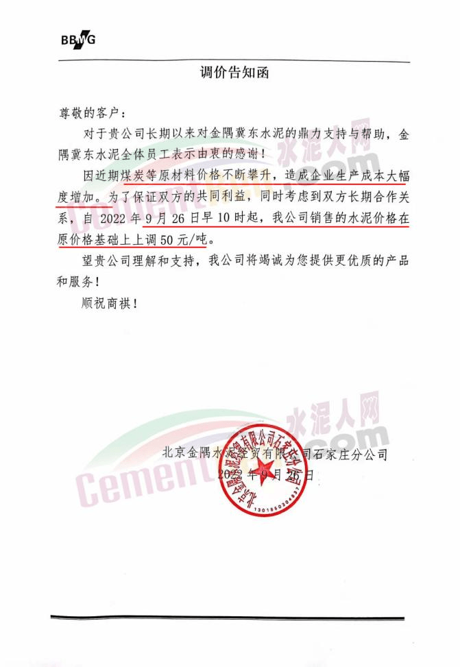 北京金隅水泥有限公司石家莊分公司通知,因近期煤炭等原料價(jià)格不斷攀升,造成企業(yè)生產(chǎn)成本大幅度增加。自9月26日早10時(shí)起,公司銷售的水泥價(jià)格在原基礎(chǔ)上上調(diào)50元/噸。